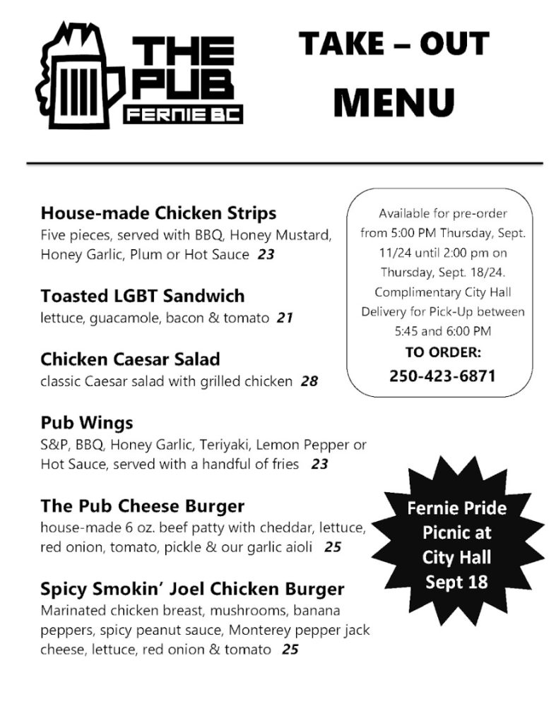 Pride Picnic Order Details. They are pre-order from The Pub and will be delivered to City Hall grounds.